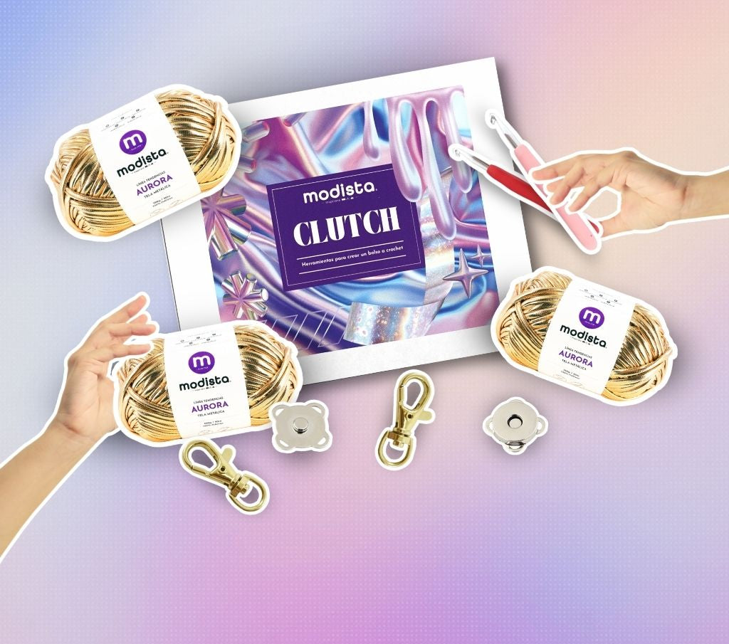 ModistaDescripción El Clutch con Aurora de Modista es un pack entretenido y elegante, pensado para que tejas tu propio bolso de fiesta y acompañes tus loo...