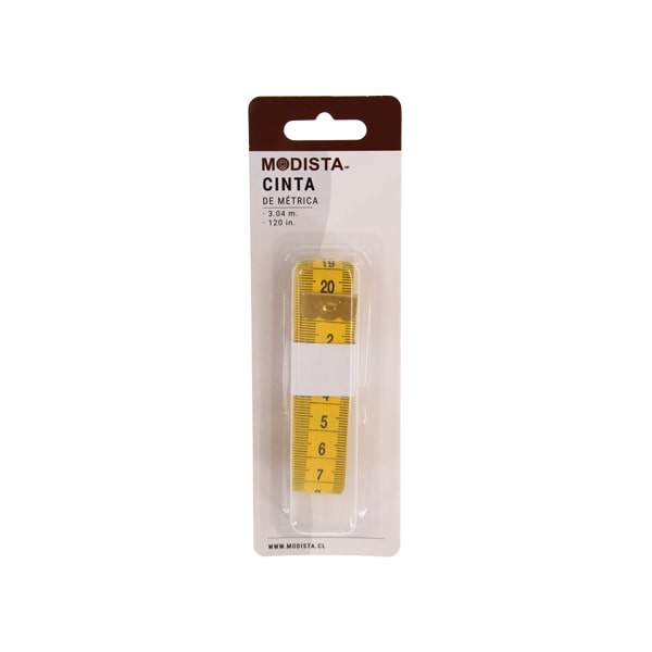 Cinta métrica o huincha de 3,04 metros de largo. Marca tanto los centímetros y como las pulgadas.
