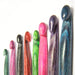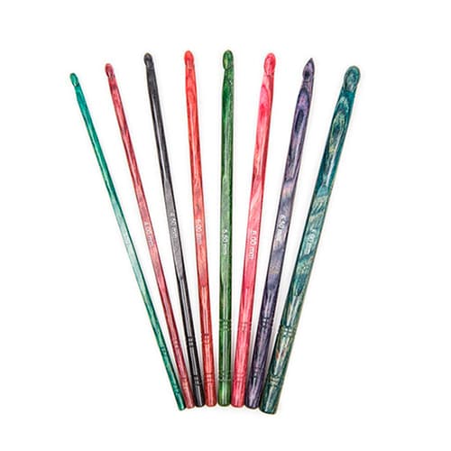 Hermosos crochet de Madera Symfonie teñida, un color para cada medida. Resistentes y ligeros. Su madera suave y perfectamente pulida permiten un deslizamiento de hilados sin enganches. Cómodos de usar y cálidos al tacto. Proporciona horas de tejido agradable sin fatiga de manos