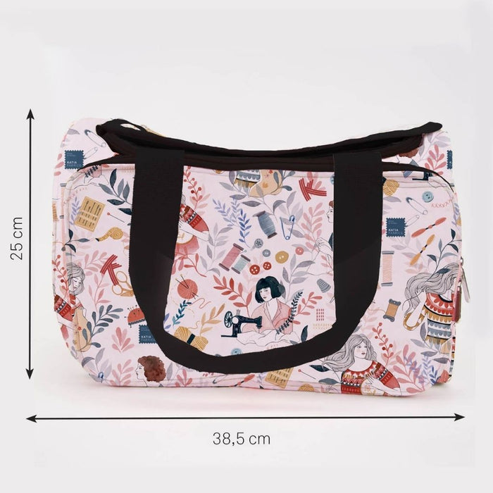 Organiza tus proyectos de costura y tejido con la nueva Knit & Sew Bag diseñada por la ilustradora Lady Desidia para Katia Fabrics. Con doble asa y múltiples bolsillos, ofrece funcionalidad y estilo. Sus compartimentos internos ajustables con velcro te permiten personalizar el espacio, mientras que tres orificios evitan enredos de hilo.