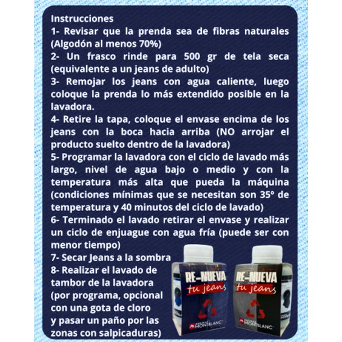 Renueva tu Jeans es un producto fabricado especialmente para teñido en lavadora, tiene todo lo que necesitas en su envase de 246 grs. Con este contenido puedes teñir 500 grs de ropa (equivalente a un jeans de adulto).