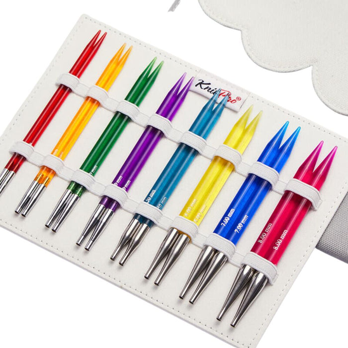 Este es el set perfecto de palillos intercambiables para el tejedor al que le gustan los colores brillantes. Cada medida tiene un espectacular color diferente a los demás para que sea fácil identificarlos y su superficie lisa altamente pulida permite un deslizamiento suave y sin enganches. Este juego contiene 8 pares de puntas de palillos intercambiables, además de 4 cables giratorios de acero inoxidable recubiertos de nailon negro (60, 80(2), 100 cm) y accesorios. Todo está empaquetado en un bonito estuche de tela gris que se puede utilizar de más de una manera.